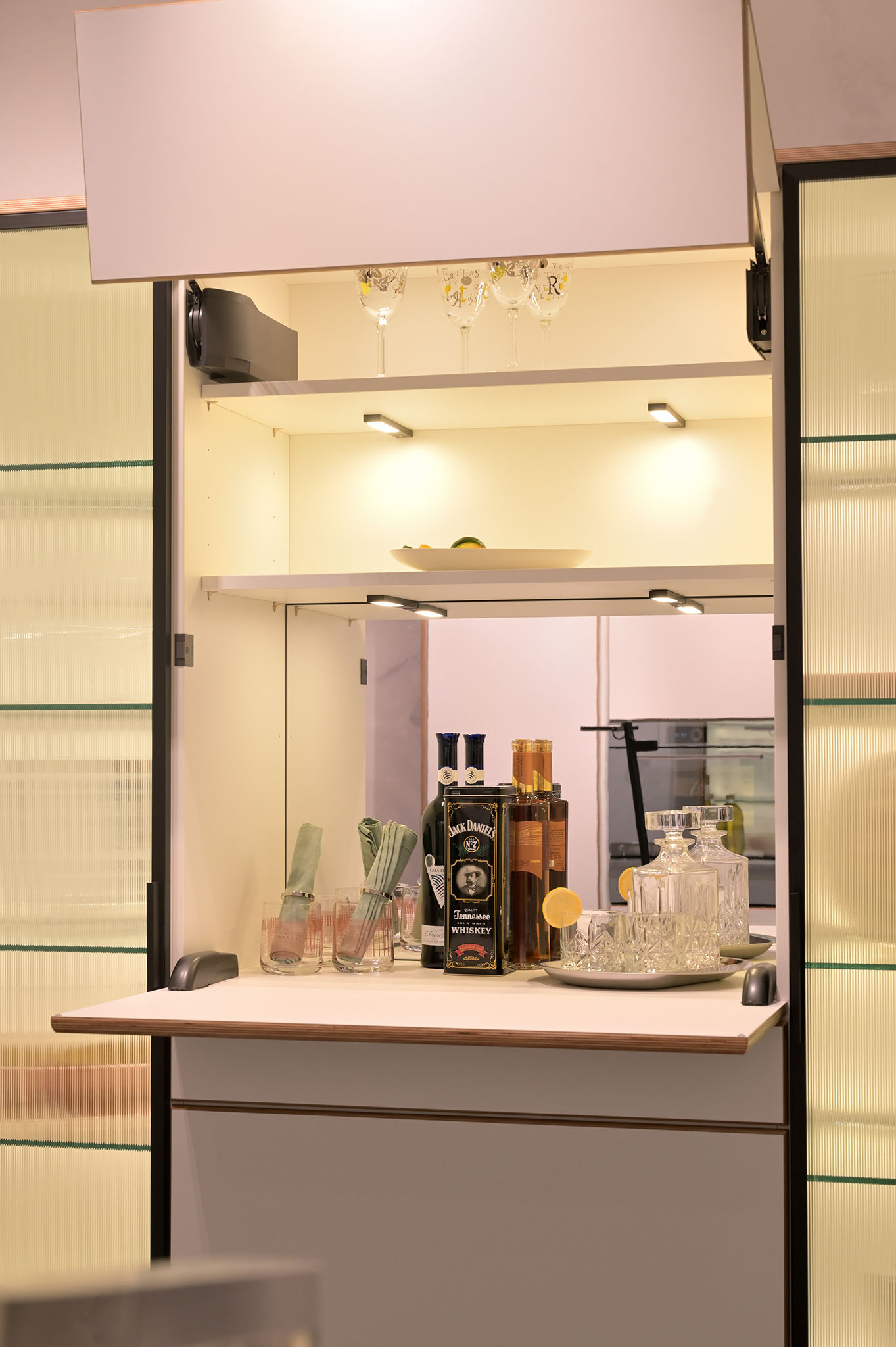 Durch eine gezielte Beleuchtung, z.B. eine neue Lichtleiste, erhalten Sie eine bessere Ausleuchtung der Arbeitsplätze. Ein Relingsystem nimmt Arbeitsgeräte auf.